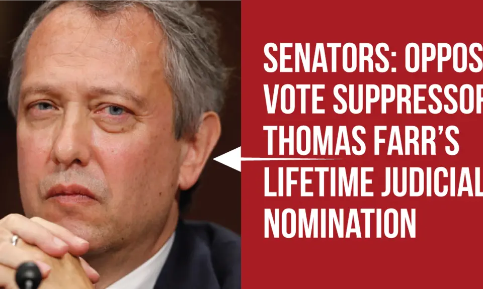 On July 13, 2017, President Trump nominated Thomas Farr to a seat on the U.S. District Court for the Eastern District of North Carolina. The Senate Judiciary Committee has scheduled Farr's hearing for September 20. People For the American Way sent the following letter to committee members to express our opposition to the Farr nomination. You can download this letter here.